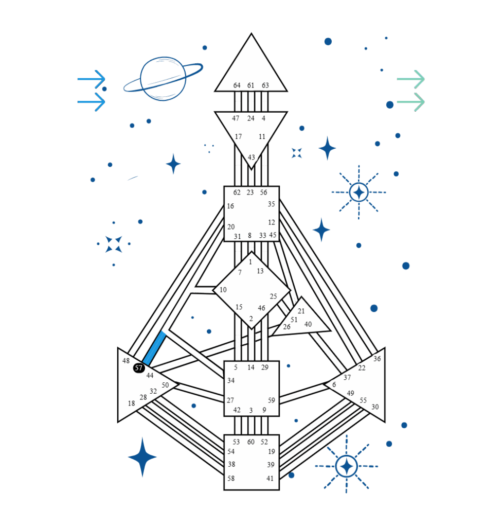In the I Ching, Gate 57 corresponds to Hexagram 57 – The Gentle Wind. Wind is persistent, subtle, and penetrating. Just as the wind reshapes the land over time, so does intuition work quietly yet powerfully. The hexagram reminds us that wisdom often comes not through force, but through gentle, steady awareness.