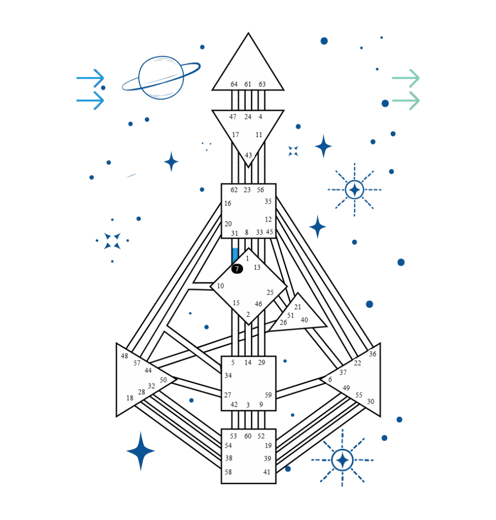 In the I Ching, Gate 7 is Hexagram 7: The Army. It’s about organization, discipline, and the role of the leader who serves their people. The “army” isn’t a force of domination—it’s a collective moving in a unified direction because the leader embodies the mission.